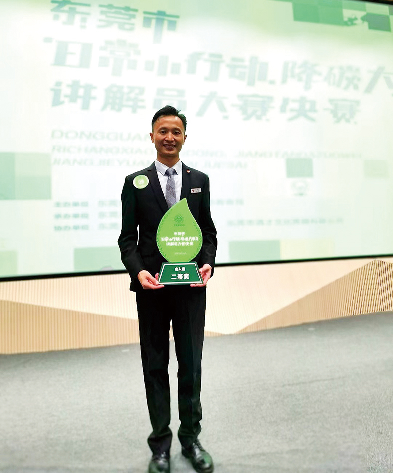 在比賽中,趙才越用生動的語言講述了樟木頭三正半山酒店系列降碳措施,分享了酒店各種降碳小妙招,最終成功在400余位選手中脫穎而出,獲得榮譽。