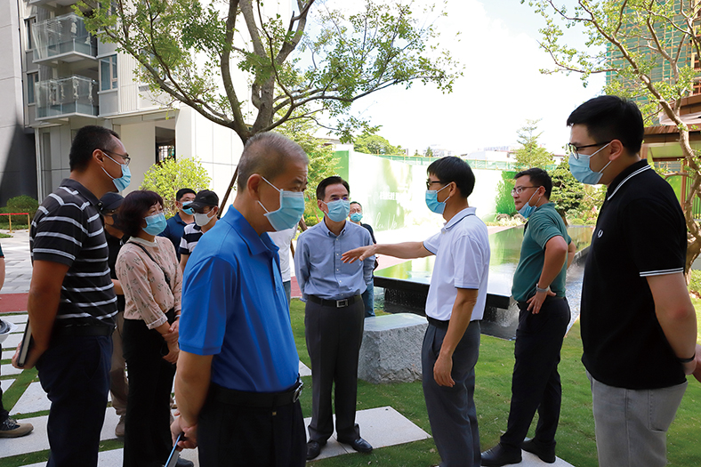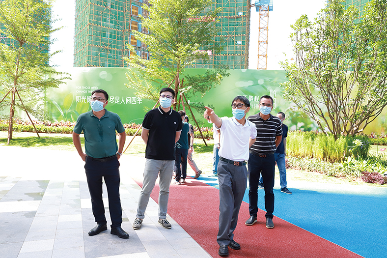 正當三正鵬程上花園項目建設如火如荼之際,7月12日,集團董事長莫浩棠、副董事長莫浩松、副總裁劉光金、集團高級顧問蒙震旦等有關領導,在三正房地產公司總經理莫永盛、常務副總經理林池軍、總工程師岑衛紅、副總經理陳雄等的陪同下,到三正鵬程上花園項目現場督察各項工作落實情況,期間重點對社區園林進行了查看。查看結束后,莫浩棠董事長在現場主持召開了討論會,對樓盤品質作了充分肯定,同時就如何把產品做得更好提出了新的要求。