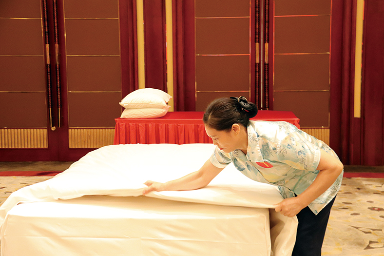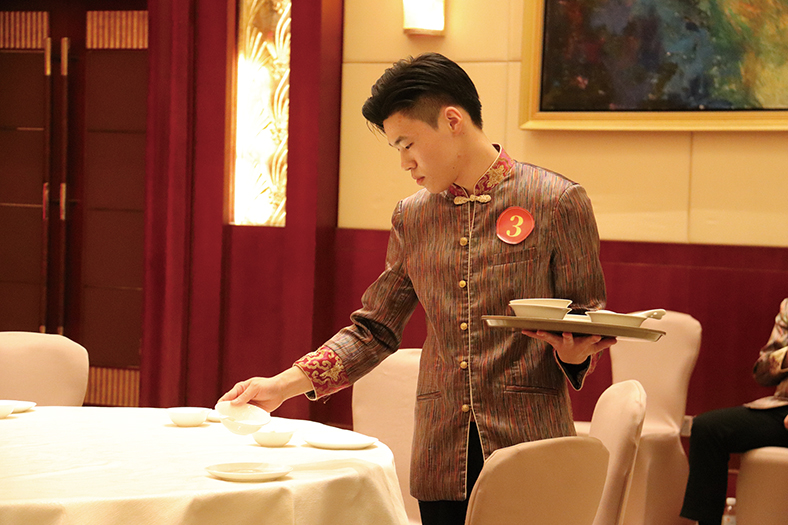 本次比賽項目涵蓋前臺接待服務、溫泉服務、西式宴會6人位擺臺、中式鋪床和中式宴會8人位擺臺及接待等。在決賽現場可以看到,前廳接待選手們儀態大方,微笑面對“客人”,從入住接待、退房結賬到服務英語,舉手投足都展示出作為酒店前臺工作人員的專業素養;溫泉部的選手們分別從打水、疊毛巾到配對拖鞋這三項基礎技能展開競技,比賽過程中選手們很好地展示了他們的專注和熱忱;在西餐宴會擺臺中,鋪餐布、放裝飾、碗、盤、碟、筷、酒杯、湯匙……依次擺開,選手們全神貫注,每一個步驟都有條不紊。規范的流程無不顯露出對工作的細心和對服務的完美追求;中式擺臺,每一件餐具、用具都擺放得恰到好處,展現出一種整齊有序的美感。這種擺臺設計不僅彰顯了中式風格的獨特魅力,更給人一種高貴、優雅的體驗;在中式鋪床比賽項目中,選手們開單、拋單、包角、定位等動作忙而不亂,鋪床單、理被套、裝枕芯、套枕頭一氣呵成,將力量與技巧融合之美展現得淋漓盡致。